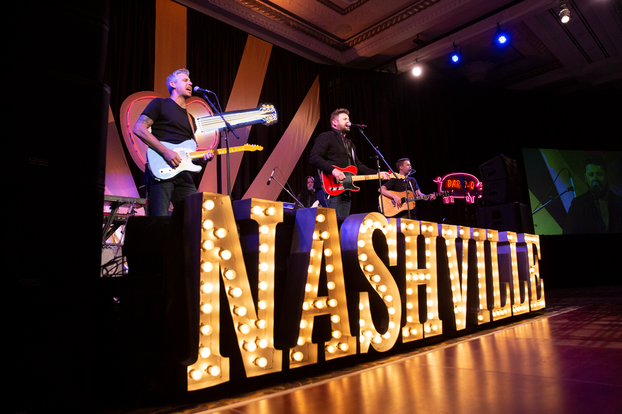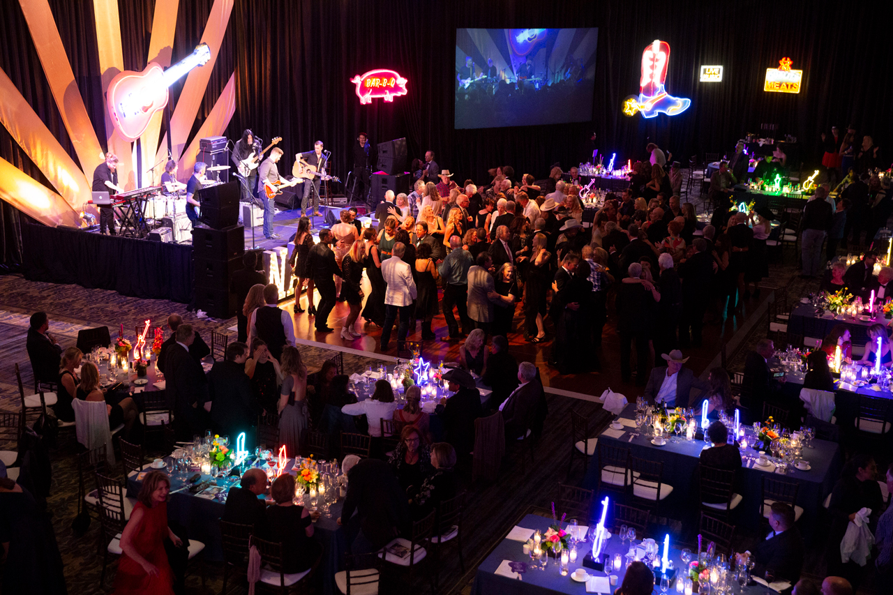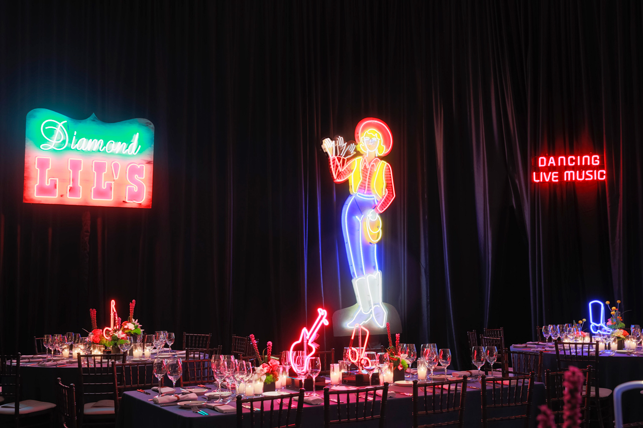 CADA's Nashville Night at the Ritz served up a heaping portion of Tennessee rock and blues with the talented artist Pryor Baird. Guests become part of the "Nashville Broadway" street scene, with buskers strumming and singing, and beverages served at the local "honky tonk." Photo ops and silent auction action, lounges and fire tables, and masses of glowing candles set the scene for the cocktail hour. Guests entered the main ballroom designed as a large Memphis dancehall, replete with a dozen neon signs, denim linens, and crisp white napkins wrapped in leather cord. Tabletop neon centerpieces glowed amidst bright floral arrangements and hundreds of candles throughout the room. A new and vibrant look, just right for this Nashville-themed gala! Highbrow-lowbrow design at its finest by the award winning design and production team at Merryl Brown Events!