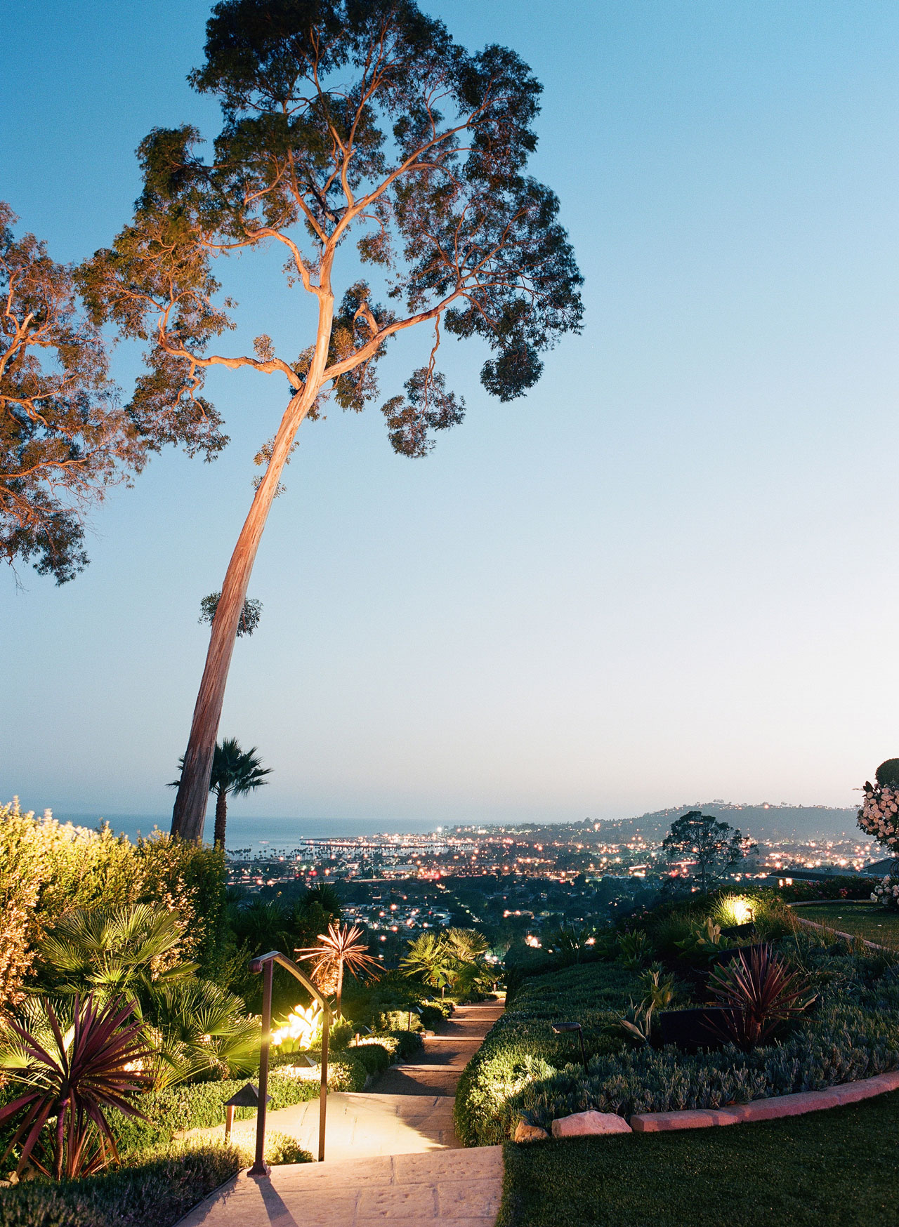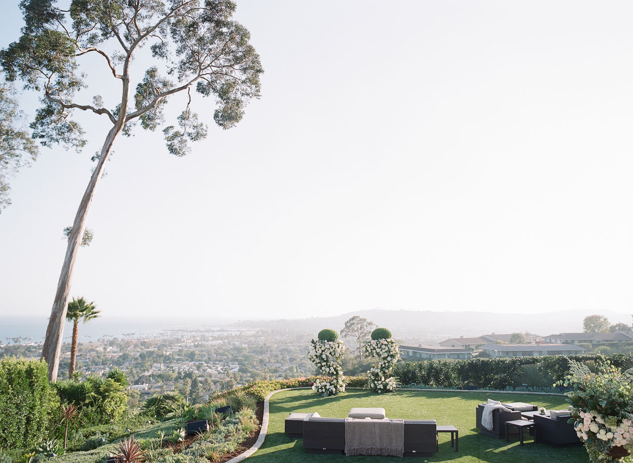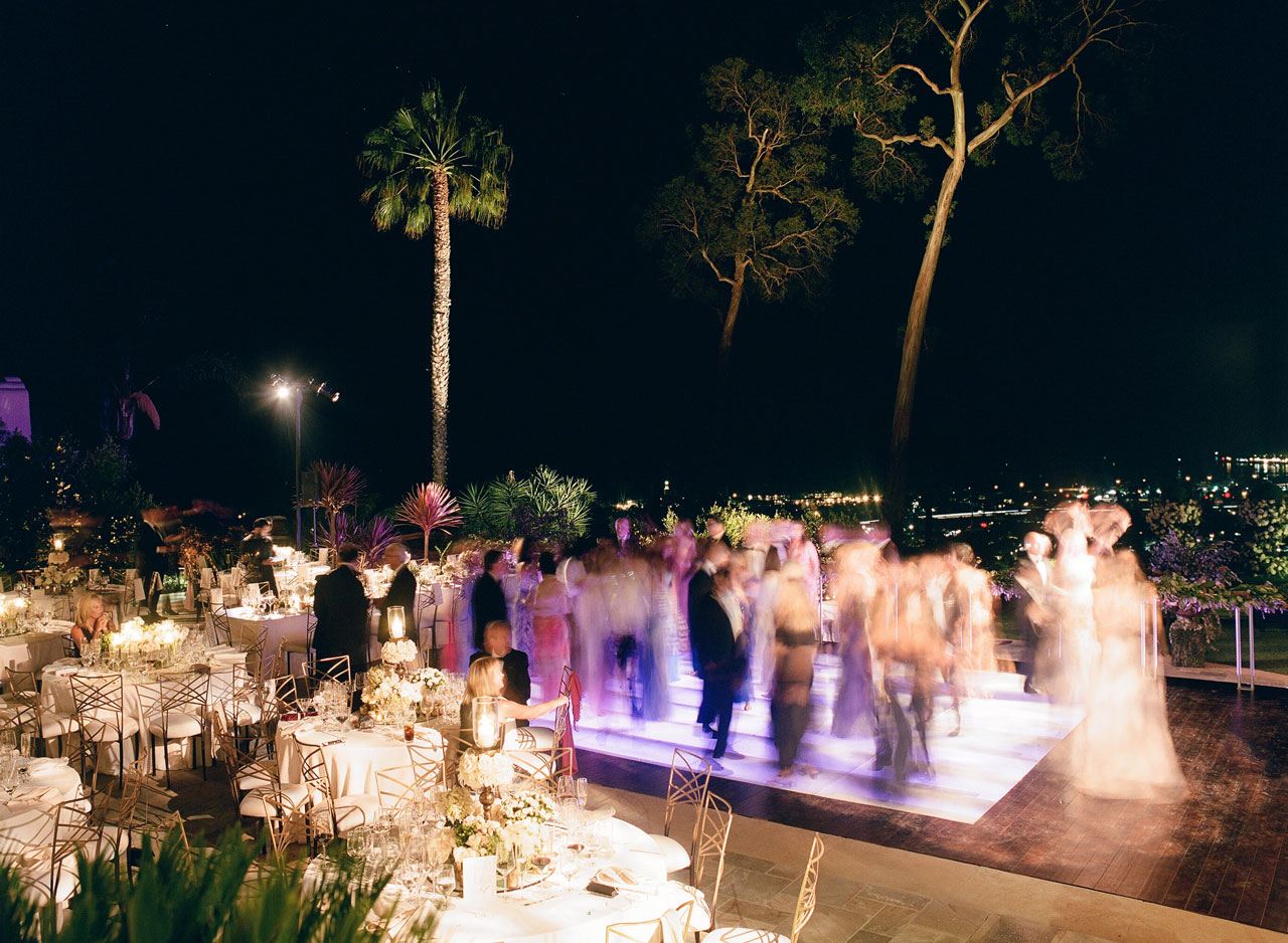 This glorious wedding took place on a perfect summer night, high above Santa Barbara, with sweeping views across the city and harbor as classical music filled the air. As each bridesmaid and groomsman walked down the aisle, another classical musician joined in, culminating in an incredible orchestra that played as the beautiful bride and her handsome father walked down the aisle. This was an evening of amazing Italian food, great music, elegant décor, and epic views. The swimming pool was covered in mahogany and plexiglass, lit from below, creating a fabulous dance floor that was packed all night. After the reception ended, draping was pulled back to reveal a nightclub created just for the occasion, where a late night dance party ensued until the wee hours of the morning. Late night bites, speciality cocktails and outdoor lounges with masses of candles under the stars made for a memorable and majestic evening.